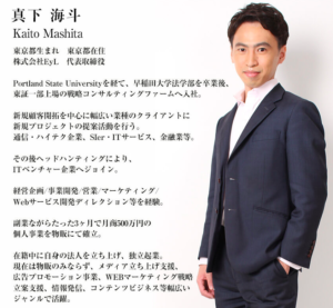 その後、在籍中に自身の法人を立ち上げ独立企業して、現在では物販だけでなく、メディア立ち上げ支援や広告プロモーション事業、WEBマーケティング戦略立案支援、情報発信、コンテンツビジネス等の幅広いジャンルで活躍されているようです。